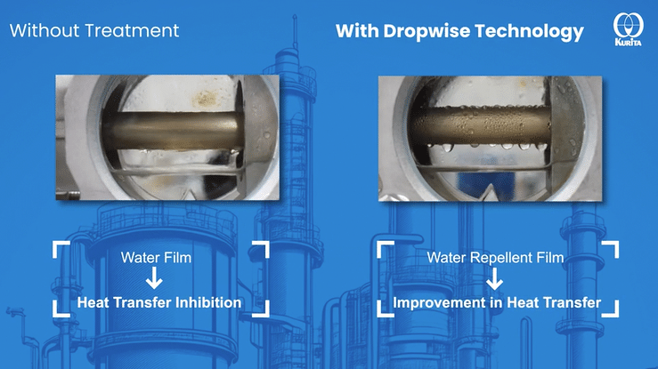 Patentovaná technologie Dropwise Condensation Technology společnosti Kurita, která má více než 75 let zkušeností s úpravou vody, je důvěryhodná pro více než 500 zákazníků po celém světě a umožňuje zlepšit produktivitu a zvýšit účinnost přenosu tepla v systémech kondenzace páry.
