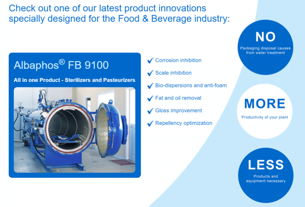 Kurita offre Albaphos® FB en tant que gamme de produits innovants pour le traitement des maladies infectieuses. les procédés de pasteurisation et de stérilisation.