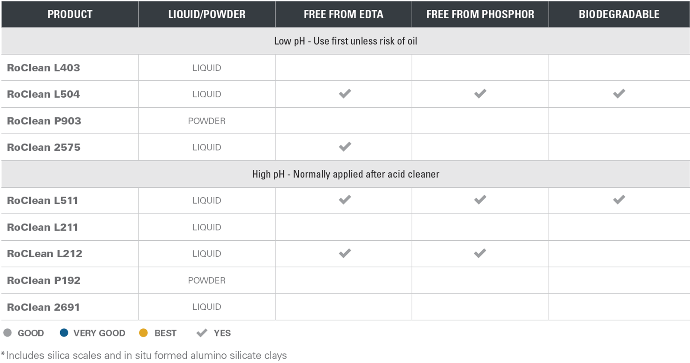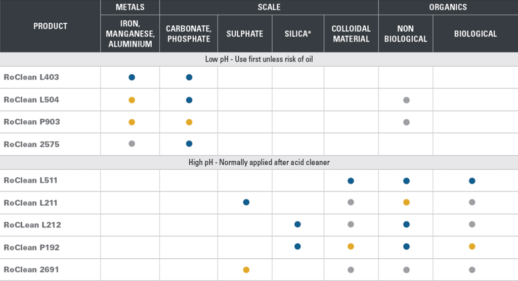 RoClean L504 och RoClean L511 är kompatibla med polyamidmembran för omvänd osmos och de flesta typer av ultrafiltrerings- och mikrofiltreringsmembran. När dessa rengöringsmedel används tillsammans har de en synergistisk verkan, vilket är fördelaktigt för att avlägsna naturliga organiska material och biofouling.